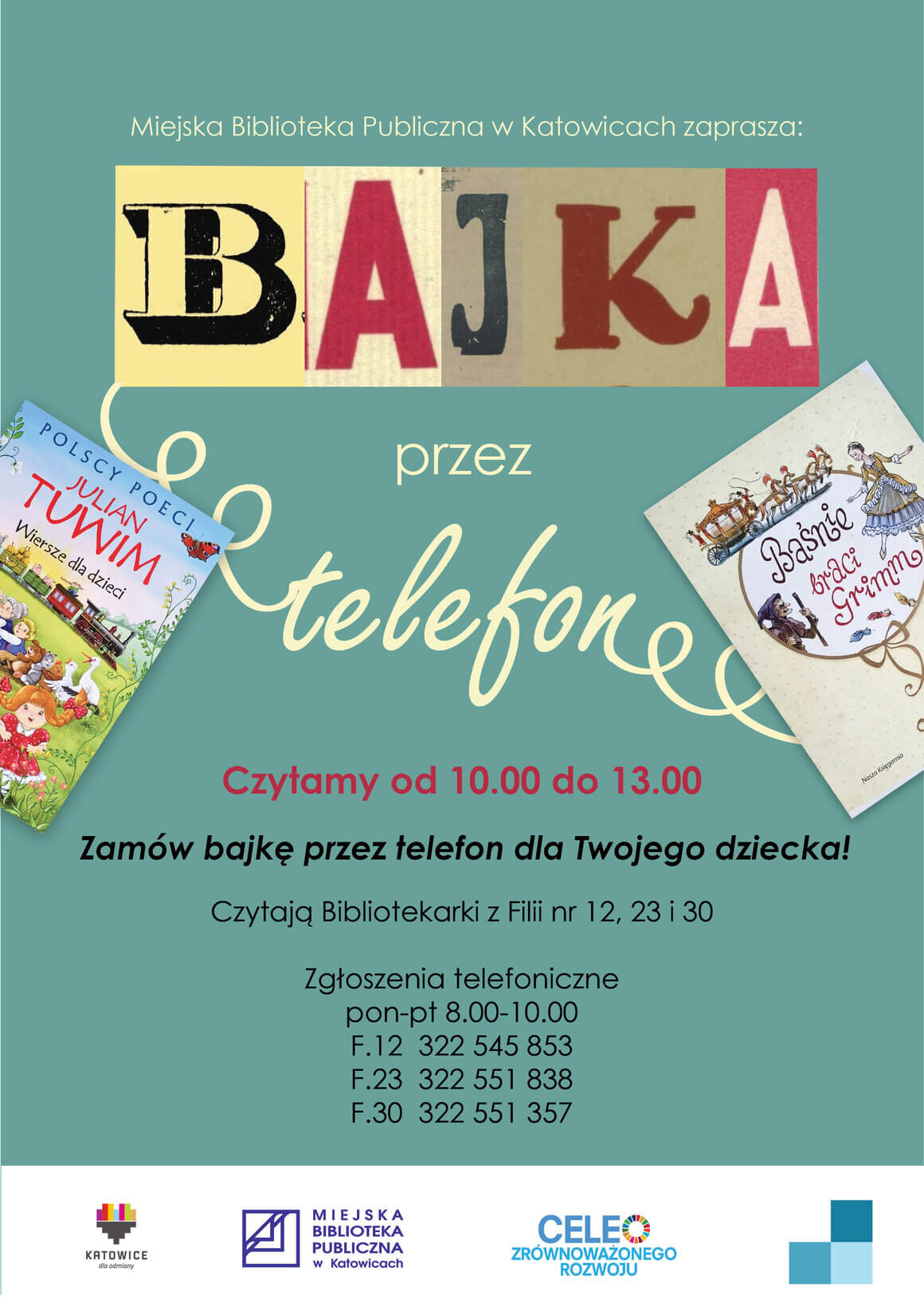 Drodzy Rodzice! Jeśli martwi Was, że Wasze dzieci nie mogą uczestniczyć w cotygodniowym "Czytaniu na dywanie" w Miejskiej Bibliotece Publicznej w Katowicach, mamy dla Was świetną wiadomość. Nie chcemy, by nasi najmłodsi Czytelnicy tak dotkliwie odczuli zamknięcie Biblioteki, postanowiliśmy zatem poprowadzić akcję "Bajka przez telefon".