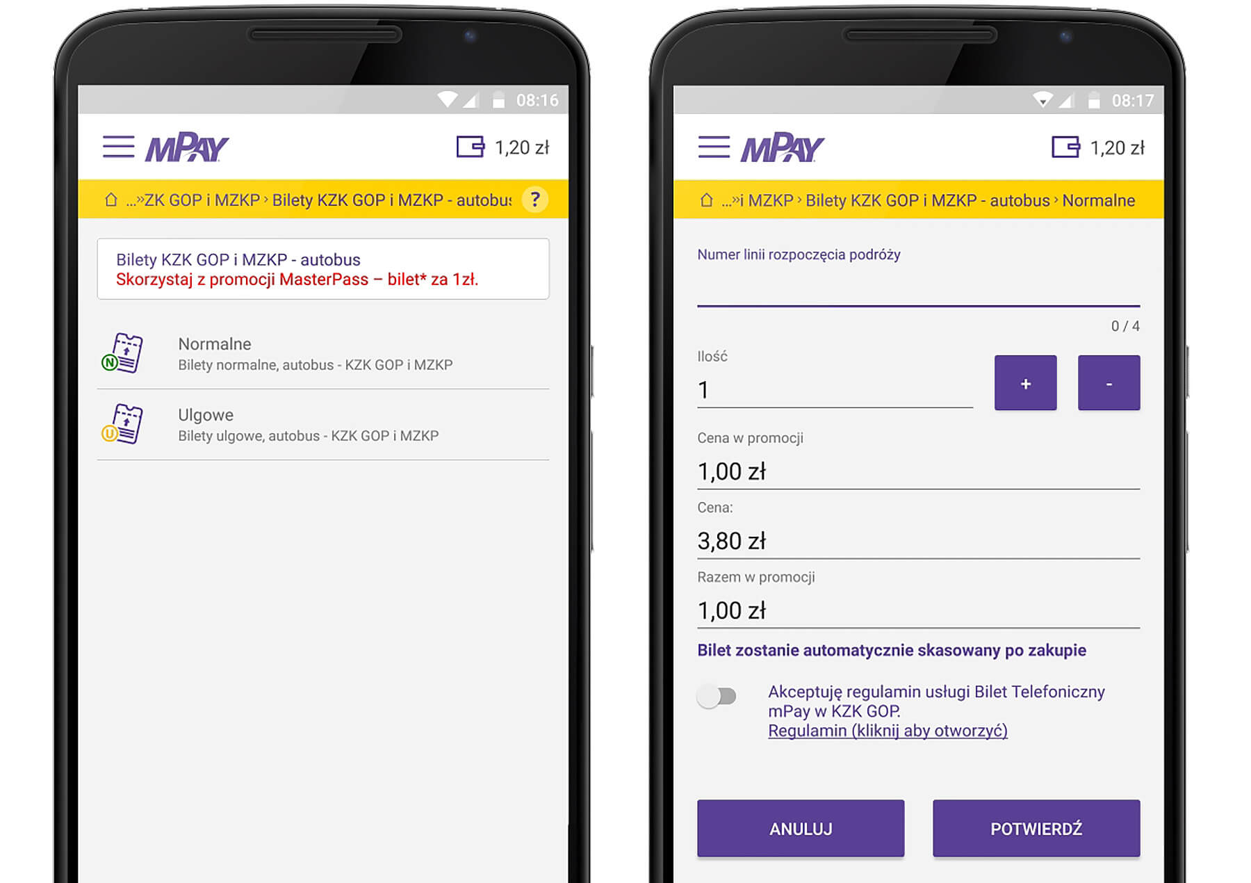 Wystarczy uruchomić mPay w komórce, a następnie wybrać KZK GOP z listy miast i jeden z dostępnych biletów. Proces ten można znacznie przyspieszyć, dodając wybrane bilety do listy ulubionych. W kolejnym kroku należy wybrać jedną z metod płatności kartą, np. mPay Wallet Masterpass, gdzie do sfinalizowania zakupu wystarczy wpisanie kodu PIN. Innym sposobem jest skorzystanie z opcji Masterpass portfel elektroniczny i dokonanie płatności za pomocą dowolnego portfela działającego w ramach Masterpass.