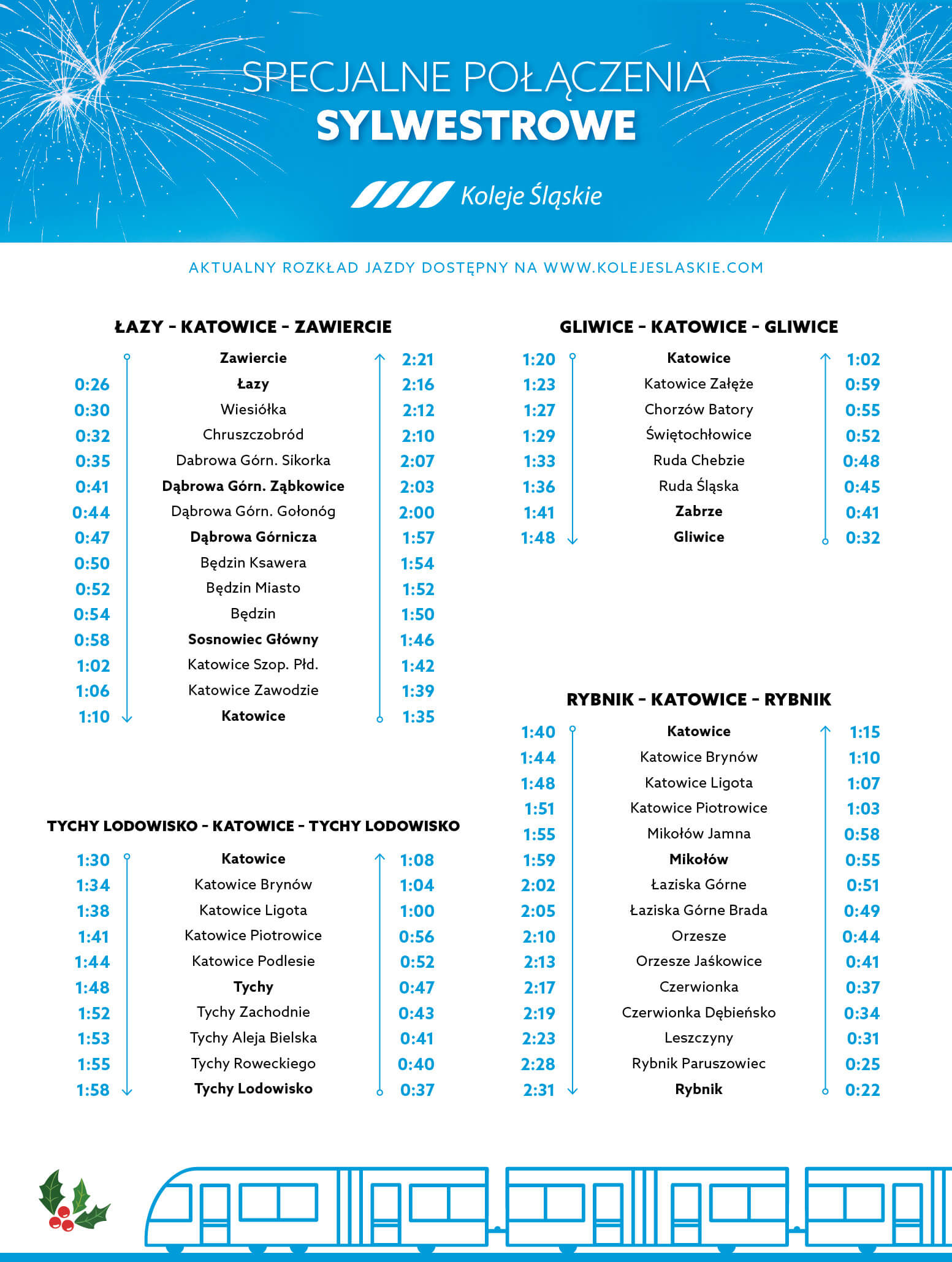 To już trzeci rok, gdy śląski przewoźnik uruchamia nocne pociągi dla uczestników sylwestrowych zabaw. W ubiegłym roku pociągi kursowały w kierunku Tychów, Gliwic i Zawiercia. W tym roku do tego zestawu po raz pierwszy dołącza także połączenie do Rybnika.