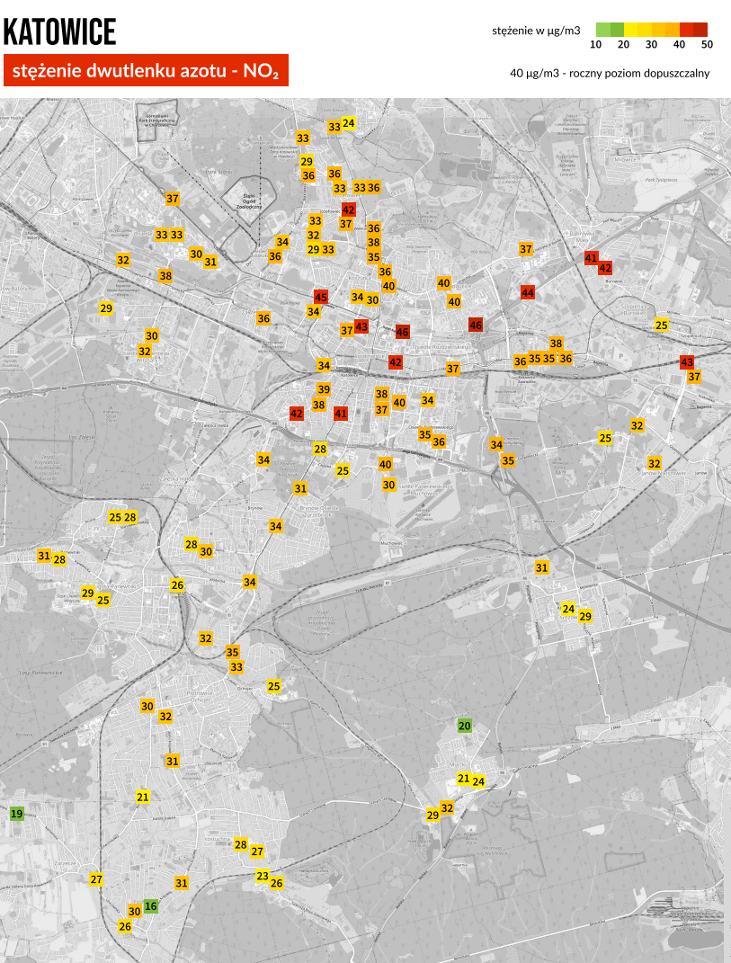 Badania przeprowadzone na przełomie stycznia i lutego 2025 roku obejmowały Katowice, Gliwice, Zabrze, Bytom, Rudę Śląską, Sosnowiec, Dąbrowę Górniczą, Chorzów, Mysłowice, Siemianowice Śląskie, Tarnowskie Góry, Piekary Śląskie, Świętochłowice i Czeladź. W sumie pobrano próbki z blisko 700 lokalizacji. W 51 z nich stężenie NO₂ przekroczyło 40 µg/m³ – dopuszczalną normę obowiązującą w Polsce.